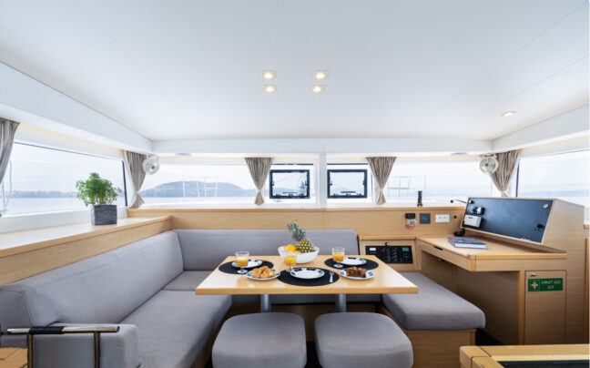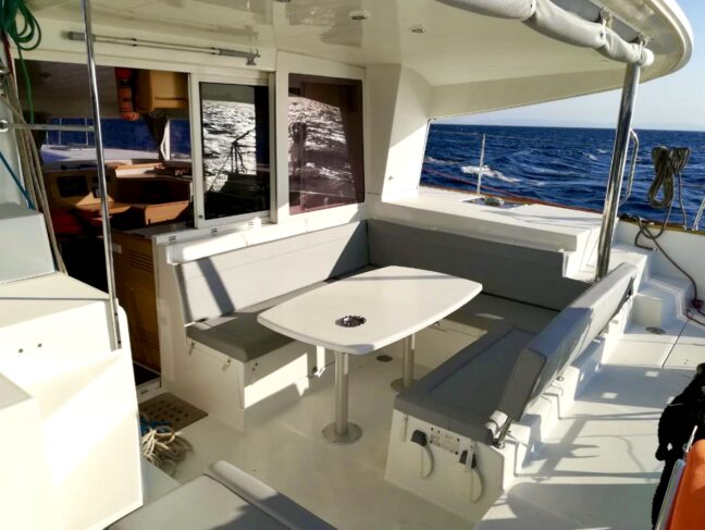 All of our catamarans have a comfortable indoor and covered outdoor seating for eating meals and relaxing.