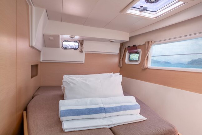 Each of the cabins on the Lagoon 400 come with reading lights, storage under the bed for shoes and gear, and a closet for hanging clothes.